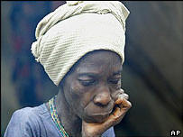 Photo: Ian Gary/CRS Poverty amidst wealth: A shack made of scrap metal stands in the shadow of a Total petroleum terminal near Djeno, Congo-Brazzaville The African Oil Boom: Peril or Opportunity for Africa's Poor People? Catholic Relief Services (November 8, 2003) Photo: Emily Wax/Washington Post Fadia Wakengela lost two children to starvation. The Mai-Mai rebel group, fighting for control of eastern Congo, has cut off villagers from food. Villagers had already lost their farming know-how after going to work in mines. Congo: Land of Plenty, Lives of Desperation, Starvation, Due to War and Colonial Legacy Emily Wax (Washington Post, November 2, 2003. You will leave this site and be required to register [once] with the Post.) Northern Uganda's Brutal War: Murder, Rape, Abductions and Mutilations in the Name of the Ten Commandments Denise Lifton (November 1, 2003) Helping Pregnant Ugandans Stay Alive Will Ross (BBC, October 24, 2003. You will leave this site) Millions Face Food Shortages in Southern Africa Amid Funding Crisis World Food Program (September 26, 2003)