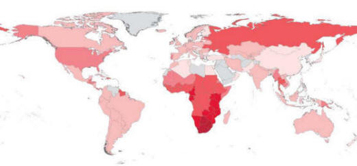 Grey: No data or <.1% .Light pink: 1% – <.5% .Darker Pink 5% – <1% Darkest pink/very light red: 1% – <5% Red: 5% – <15% >Darkest red15% – 28%