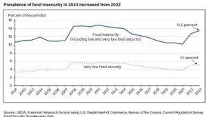 However, according to the USDA Household Food Security Report of 2023, food insecurity has been on the rise since 2020.  Across the 4-year period, the prevalence of food insecurity (those with low and very low food insecurity) among US households rose from 10.5% in 2020 to 13.5% in 2023, an increase of just less than 5 million households – representing 47.5 million Americans.  The same trend is seen with the prevalence of households with very low food security rising from 3.9% in 2020 to 5.1% in 2023, representing 1.7 million households.  According to the USDA, the definition of a food insecure household is one which had difficulty at some time during the year providing enough food for all their members because of a lack of resources.  A household with very low food security was one in which the food intake of some members of the household was reduced, and normal eating patterns were disrupted at times during the year because of limited resources.